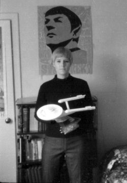 My friend Ron Miller took this photo, and the negatives recently re-surfaced in his files. I'm guessing a date around late 1968 or early '69 on this. Too bad the focus isn't quite sharp enough to read the titles on the bookshelf behind me, though I think I recognize a couple of them (one is certainly Collected Poems by Edna St. Vincent Millay; I can make out the shape of the lettering on the spine. I still have that one.) The Trek interest is, snerch, obvious enough; less obvious is the fact that the poster on the door to my right (viewer's left) is from the Ballantine paperback edition of The Lord of the Rings, which I first read in 1965. Science fiction and fantasy, and early modern geekdom and aspiring artists/writers; it was all there in microcosm, I suppose. On both sides of that camera. I must have built that model from a kit; I can't now figure out if the Spock poster was homemade or commercial. Fandom was more of a do-it-yourself world back then.